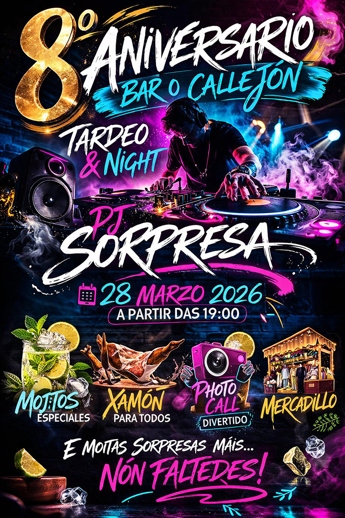 O vindeiro sábado 28 de marzo o Bar O Callejón, en Viana do Bolo, celebrará o oitavo aniversario cunha gran festa “tardeo & nigth” cargada de sorpresas.