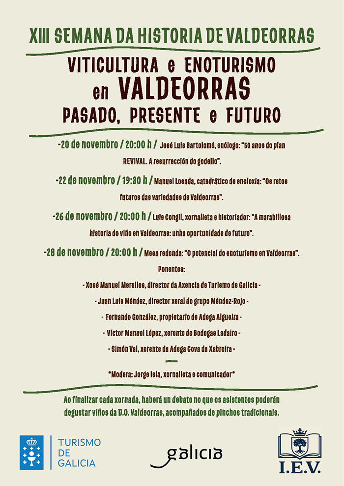 Baixo o lema “Viticultura e Enoturismo en Valdeorras. Pasado, presente e futuro”, a Casa Grande de Viloira, sede do IEV, acollerá un completo programa que contempla catro datas no mes de novembro. Na primeira delas, o día 20 de novembro ás 20 horas, o enólogo José Luis Bartolomé será o encargado de desenvolver a ponencia “50 anos do plan REVIVAL. A resurrección do godello”. Na segunda cita coa historia, o protagonista será o catedrático de Enoloxía, Manuel Losada, quen falará dos “retos futuros das variedades de Valdeorras” nunha conferencia programada para o día 22 de novembro ás 19:30 horas. O xornalista e historiador Luis Congil desenvolverá a súa intervención “A maravillosa historia do viño en Valdeorras: unha oportunidade de futuro”, o día 26 de novembro ás 20 horas.