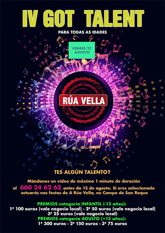 Para participar, todo aquel que teña algún talento e queira, ten que enviar ao 660 246 262 e antes do 15 de agosto, un vídeo de 1 minuto de duración como máximo no que demostre todo o seu arte. Os seleccionados actuarán no Campo de San Roque, no marco das festas.