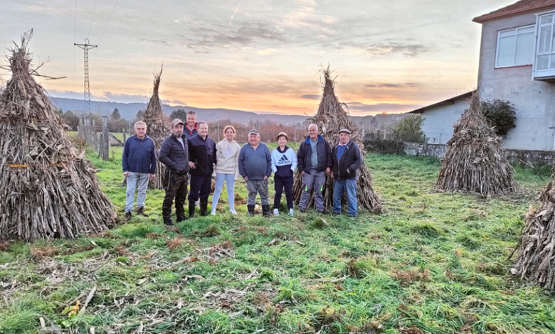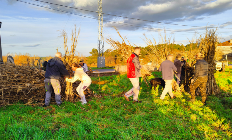 Por outro lado, cortouse a palla do millo para elaborar por segundo ano os píos, “unha construción agrícola que antigamente enchían as fincas traballadas de toda a parroquia de Sande. A súa finalidade era servir de cama ao gando. Pero, chegada a noite de fin de ano, a modo de trastada, os mozos queimaban os píos duns a outros. Unha especie de divertida rivalidade que facía que esa noite Sande se iluminase co lume que desprendían estas construcións”, explican dende esta asociación cultural.