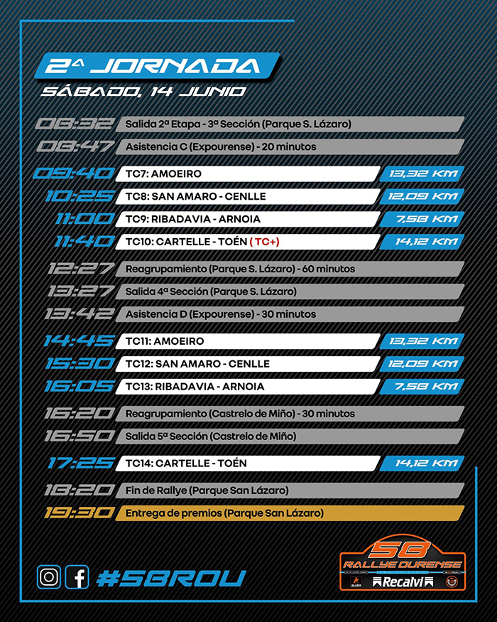 Coma sempre a zona de asistencia e a oficina da carreira estarán en Expourense. Para o sábado 14 de xuño, segunda e última xornada de competición, están previstos outros catro tramos a dobre pasada: Amoeiro (09:40 e 14:45h.), San Amaro-Cenlle (10:25 e 15:30h.), Ribadavia-Arnoia (11 e 16:05h.) e Cartelle-Toén (11:40 e 17:25h.) que marcará o final desta edición na que se espera moita calidade.