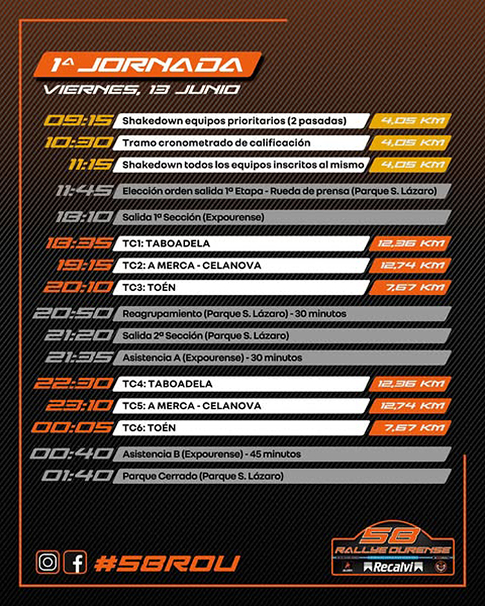 Con todo, o 58 Rallye de Ourense comezará oficialmente o xoves 12 de xuño coa cerimonia de saída ás 22:30 horas desde San Lázaro, onde tamén estará o parque pechado na noite do venres ao sábado, o reagrupamento do sábado ao mediodía e a entrega de trofeos o sábado pola tarde. A primeira xornada de competición (venres 13 de xuño) estará composta por tres tramos cronometrados a dobre pasada: Taboadela (18:35 e 22:30h.), A Merca-Celanova (19:15 e 23:10h.) e Toén (20:10 e 00:15h.) pechando a primeira etapa da cita puntuable para o Súper Campionato de España de Rallyes.
