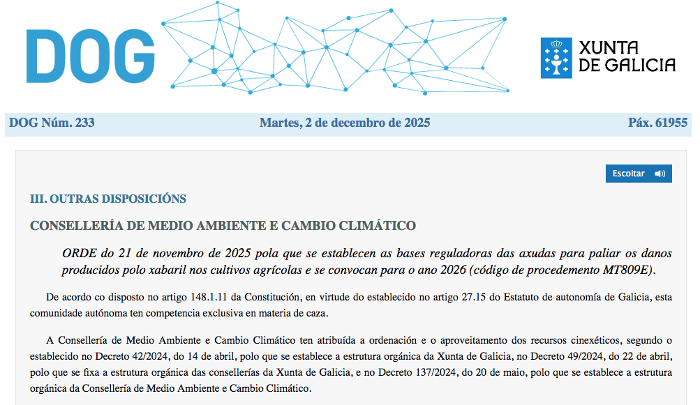 A Xunta de Galicia, a través da Consellería de Medio Ambiente e Cambio Climático, publica hoxe no Diario Oficial de Galicia tres ordes de axudas co obxectivo común de fomentar o equilibrio e a convivencia entre a fauna silvestre e aquelas actividades humanas coas que convive no territorio.