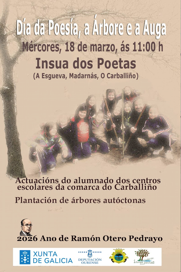 Coincidindo coa entrada da primavera, o vindeiro mércores 18 de marzo, a partir das 11h., terá lugar na Insua dos Poetas, a Celebración do Día Mundial da Poesía, a Árbore e a Auga. A Fundación Insua dos Poetas (en Esgueva, Madarnás, O Carballiño) vén realizando anualmente esta actividade desde o 2010 en colaboración cos centros de ensino desta comarca.