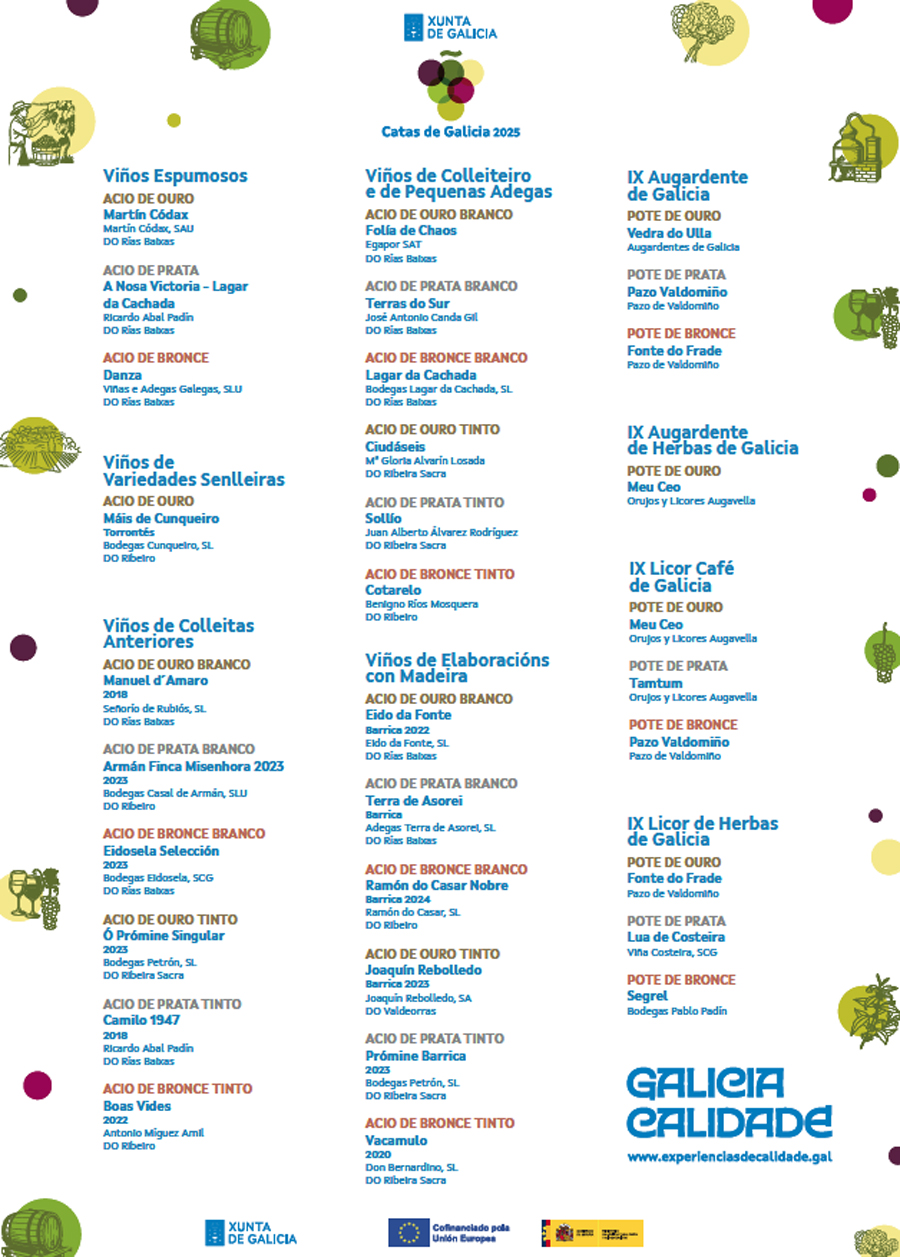 Os resultados da XXXVII Cata de Viños de Galicia, a XXVII Cata de Augardentes e a XIV Cata de licores tradicionais desvelábanse esta tarde. Nesta ocasión o galardón ao mellor viño branco galego era para o Eduardo Peña (da Adega Eduardo Rodríguez e Luz Cánovas, SC) da Denominación de Orixe Ribeiro e o mellor tinto recaía no Prómine (Adegas Petrón SL) da D.O. Ribeira Sacra. A cerimonia de entrega de galardóns estaba presidida polo presidente da Xunta de Galicia, Alfonso Rueda, quen destacaba o papel do sector vitivinícola á hora de fixar poboación e dinamizar a economía no rural, atraer novos turistas á comunidade e exercer como embaixador do que significa Galicia Calidade. Por iso, anunciou que o Executivo autonómico reforza o seu apoio a este eido con máis de 12 millóns de euros reservados nos orzamentos de 2026.