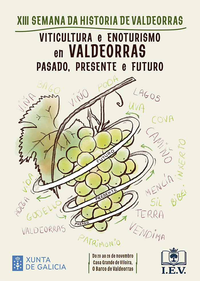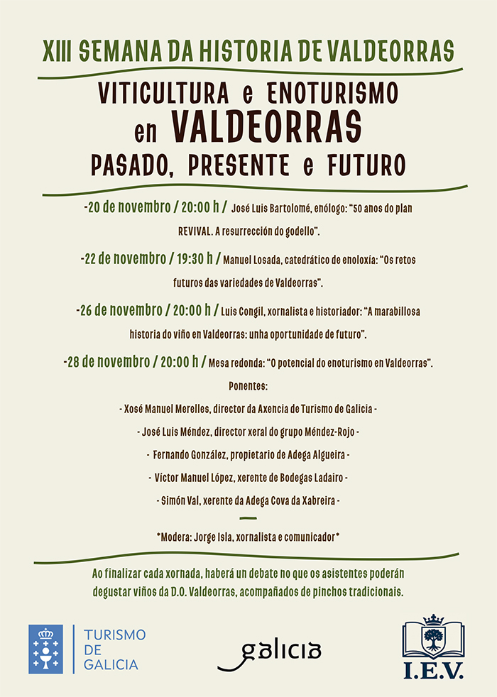 Baixo o lema “Viticultura e Enoturismo en Valdeorras. Pasado, presente e futuro”, a Casa Grande de Viloira, sede do IEV, acollerá un completo programa que contempla catro datas no mes de novembro. Na primeira delas, o día 20 de novembro ás 20 horas, o enólogo José Luis Bartolomé será o encargado de desenvolver a ponencia “50 anos do plan REVIVAL. A resurrección do godello”. Na segunda cita coa historia, o protagonista será o catedrático de Enoloxía, Manuel Losada, quen falará dos “retos futuros das variedades de Valdeorras” nunha conferencia programada para o día 22 de novembro ás 19:30 horas. O xornalista e historiador Luis Congil desenvolverá a súa intervención “A maravillosa historia do viño en Valdeorras: unha oportunidade de futuro”, o día 26 de novembro ás 20 horas.