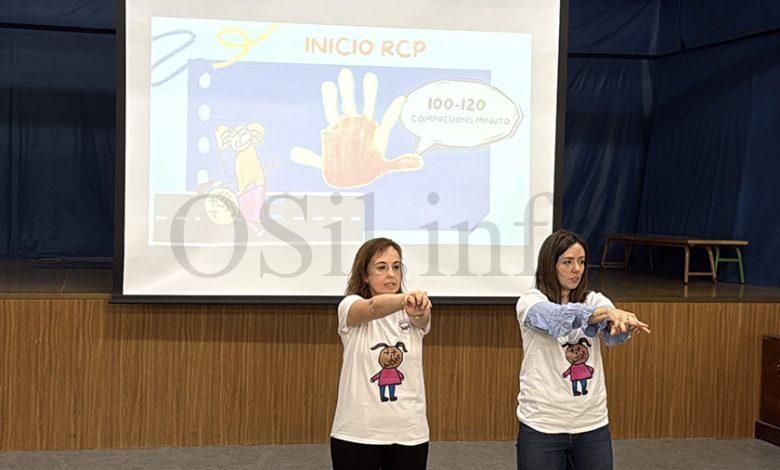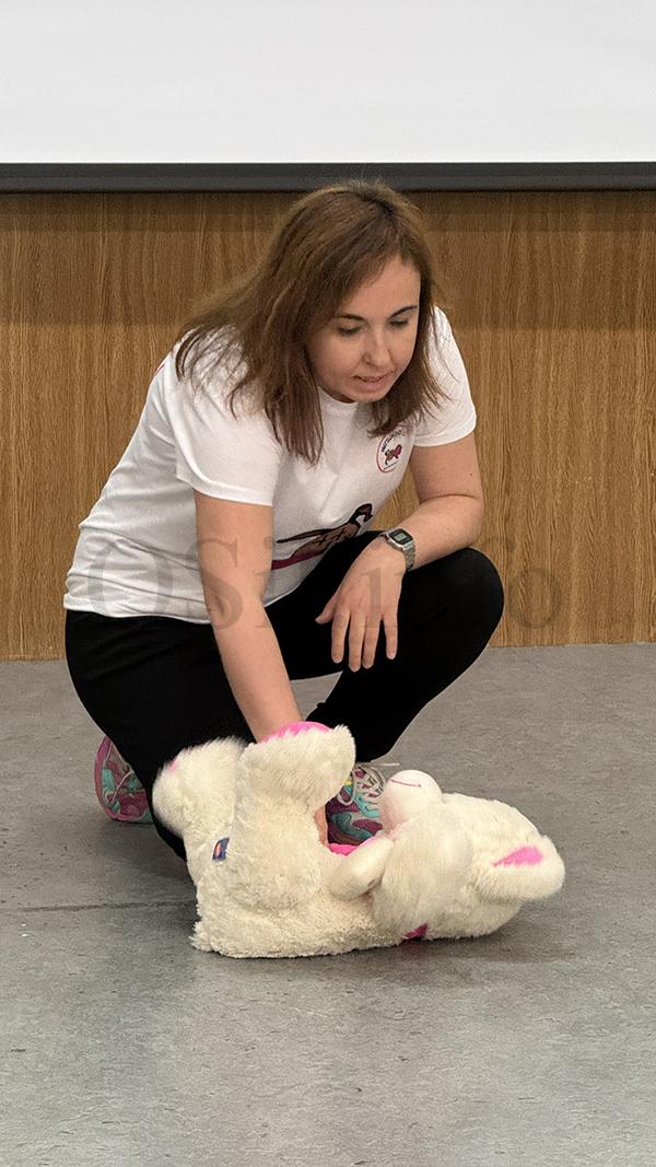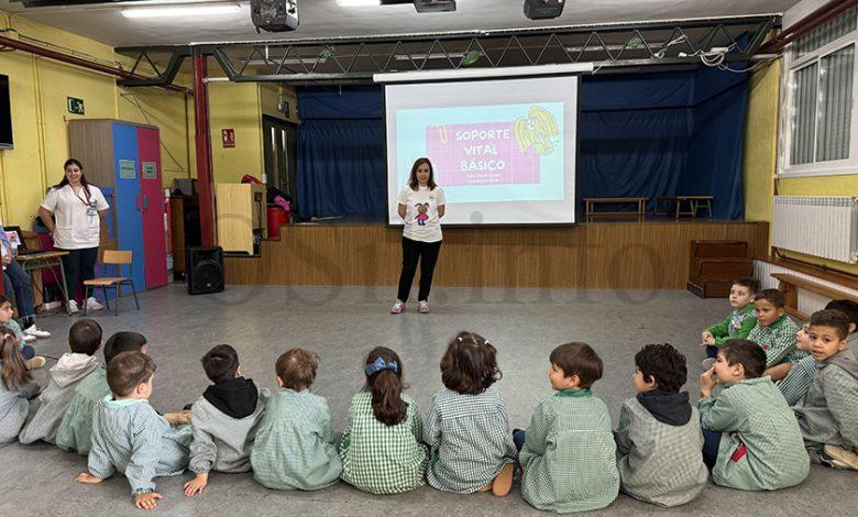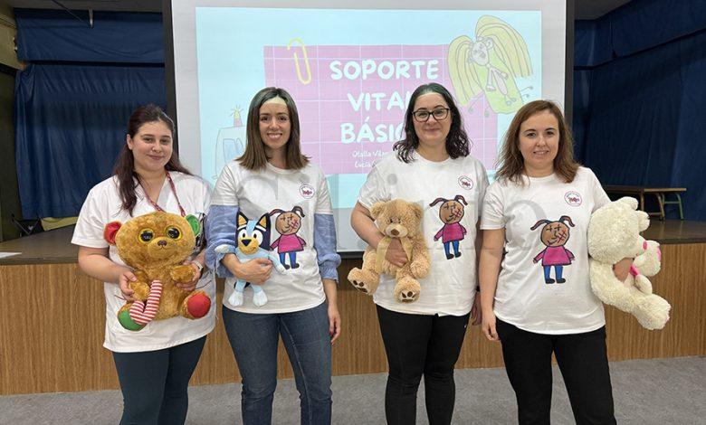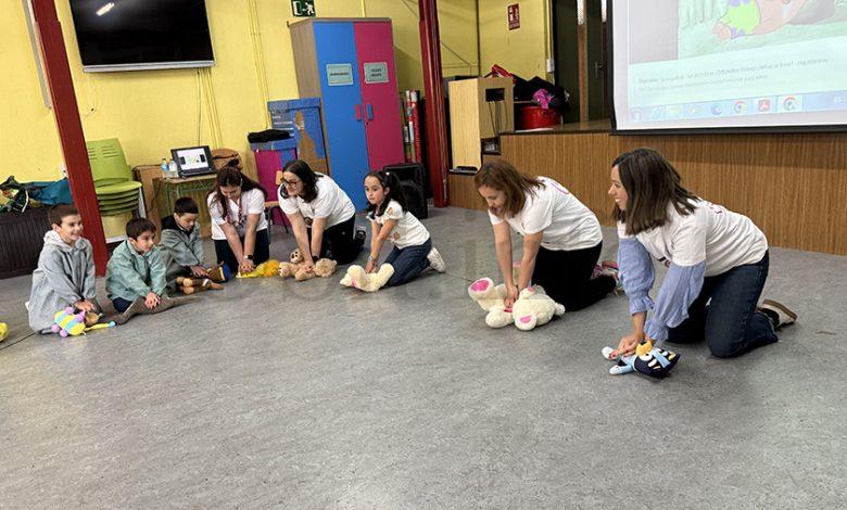 “Está principalmente orientado a dúas cuestións: a posición lateral de seguridade, en caso de alguén estea durmido, que é como o explicamos, e que respira, pois que saiban que hai que avisar ao 112. E logo que visualmente saiban onde hai un desfibrilador, e amosámoslle o logotipo para que fixen e saiban o que é, que de feito en case todos os colexios de Valdeorras hainos. E, despois a reanimación RCP, cun peluche e cunha canción adaptada aos nenos e na que mostra o ritmo para que saiban como actuar e que, pouco a pouco, se lles vaian quedando cousas”, explica a enfermeira Susana Fernández, do Equipo Soporte de Atención Domiciliaria (ESAD), unha das que impartía a formación, xunto á enfermeira Isabel Navarro e á enfermeira pediátrica Beatriz Rodríguez, as tres do Centro de Saúde do Barco. Ademais estaban acompañadas por unha enfermera en prácticas neste mesmo centro, Enya Real.