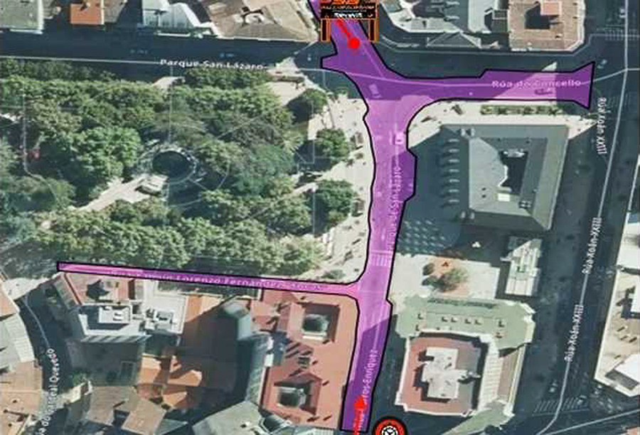 O tráfico procedente de Xoán XXIII en dirección ao Parque de San Lázaro, desviarase por Xoán XXIII (parte traseira da Subdelegación do Goberno) e o tráfico de Rúa Concello deben virar á dereita en dirección centro cidade.