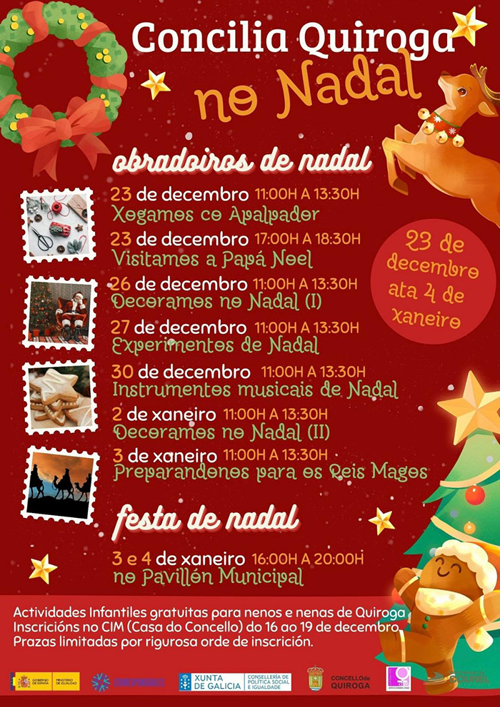 Co fin de “axudar ás familias de Quiroga, coa atención dos seus fillos e fillas no Nadal”, a área de Educación, Infancia e Igualdade, pon en marcha novamente o programa Concilia Quiroga, motivado pola “boa acollida que tivo durante o verán e tamén”, como destacou a concelleira que dirixe este departamento, Maite Pérez Grao, “pola vontade de axudar ás familias a conciliar este tempo de vacacións para os máis pequenos da casa cubrindo ese tempo de ocio gratuitamente”.