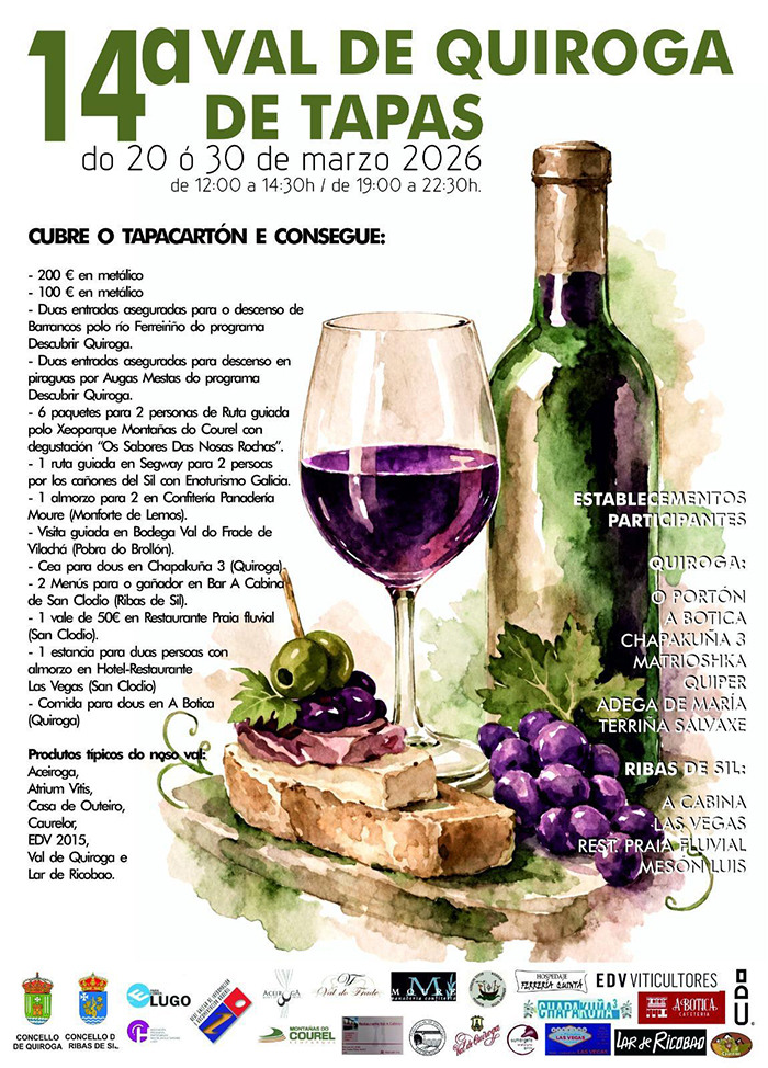 Entre o 20 e o 30 de marzo celebrarase a XIV edición do Val de Quiroga de Tapas. Once establecementos serán os que participen este ano, sete de Quiroga: O Portón, A Botica, Chapacuña 3, Matrioshka, Quiper, a Adega de María e o mesón Terriña Salvaxe; e catro de Ribas de Sil: A Cabina, Las Vegas, Restaurante Praia Fluvial e Mesón Luís.