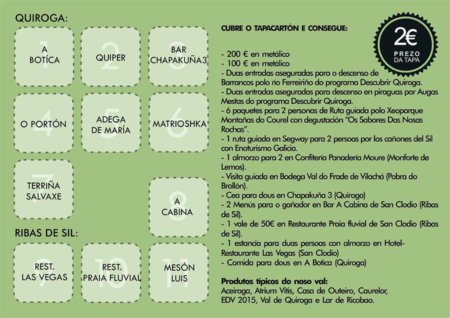 O establecemento gañador recibirá unha placa conmemorativa e 100€ en metálico. Pero ademais os participantes que completen a degustación das tapas e voten á tapa que máis lles gustou entrarán nun sorteo no que poden gañar diferentes premios. 200€ e 100€ en metálico; dúas entradas para o descenso de Barrancos polo río Ferreiriño do programa Descubrir Quiroga; dúas entradas pra o descenso en piraguas por Augas Mestas do programa Descubrir Quiroga; seis paquetes para 2 persoas da ruta guiada polo Xeoparque Montañas do Courel con degustación dos “Sabores das nosas rochas”; unha ruta guiada en Segway para dúas persoas polos canóns do Sil con Enoturismo Galicia; un almorzo para dous na Confitería Panadería Moure de Monforte de Lemos; unha visita guiada en Bodega Val do Frade de Vilachá na Pobra do Brollón; unha cea para dúas persoas en Chapakuña 3; dous menús en Bar a Cabina de San Clodio; un vale de 50€, no restaurante Praia Fluvial de San Clodio; unha estancia para dúas persoas con almorzo no Hotel-Restaurante Las Vegas de San Clodio; Unha comida para dous na Botica ou cestas con produtos típicos da zona: Aceiroga, Atrium Vitis, Casa de Outeiro, Caurelor, EDV 2015, Val de Quiroga e Lar de Ricobao.
