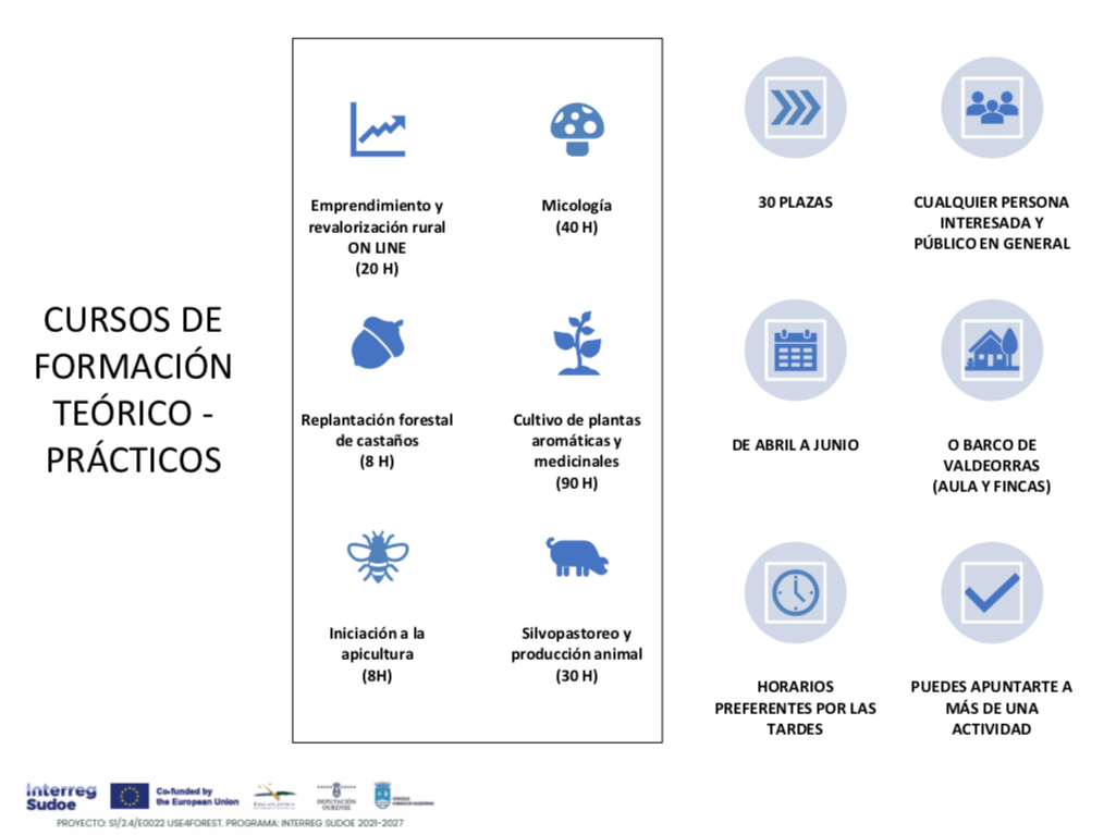 No marco do proxecto, o Concello do Barco pon á disposición do proxecto un espazo no Viveiro de Empresas para que todos os interesados adquiran a capacitación laboral necesaria que lles permita realizar os diferentes aproveitamentos forestais. A formación incluirá cursos de formación teórico-prácticos das seguintes materias: emprendemento e revalorización rural (online), micoloxía, replantación forestal de castiñeiros, cultivo de plantas aromáticas e medicinais, iniciación á apicultura e silvopastoreo e produción animal. Dita formación está aberta tanto a persoas que dispoñan de terreos, como a quen queira iniciarse neste tipo de actividades.