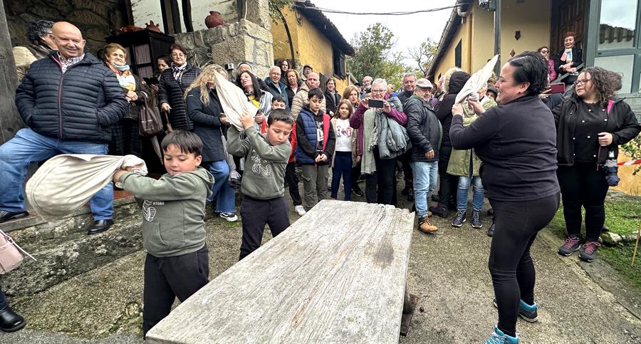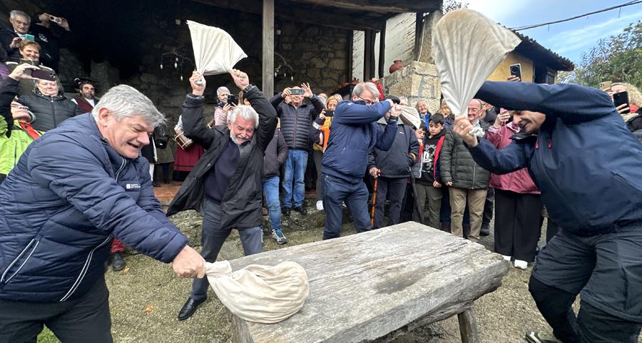 E tras as palabras, dábase paso á tradición. Dende o sequeiro ían chegando os sacos coas castañas secas para comezar coa recreación da pisa. Unha vez alí, por quendas de catro persoas batían á vez sobre un tallo de madeira eses sacos nun ambiente festivo e animado pola música tradicional, ante a atenta mirada do público.