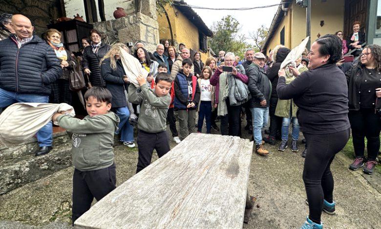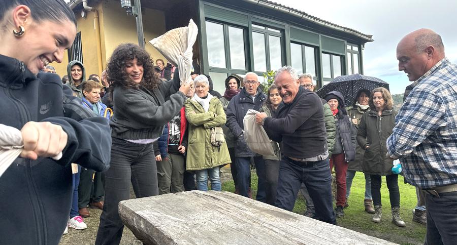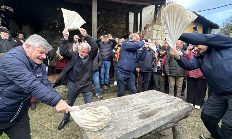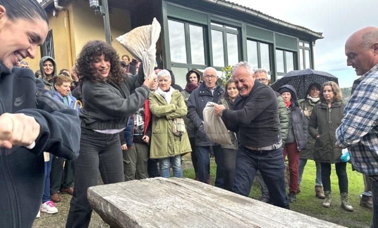 E tras as palabras, dábase paso á tradición. Dende o sequeiro ían chegando os sacos coas castañas secas para comezar coa recreación da pisa. Unha vez alí, por quendas de catro persoas batían á vez sobre un tallo de madeira eses sacos nun ambiente festivo e animado pola música tradicional, ante a atenta mirada do público.