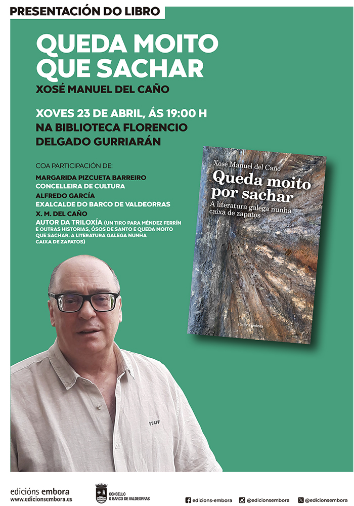 Na tarde deste xoves 23 de abril, coincidindo co Día do Libro, presentarase na biblioteca Florencio Delgado Gurriarán no Barco de Valdeorras, Queda moito que sachar (A literatura galega nunha caixa de zapatos) de Xosé Manuel del Caño, libro que pecha a triloxía sobre autores e outros protagonistas da literatura galega desde a Longa Noite de Pedra ata a actualidade, que abriron Un tiro para Méndez Ferrín e outras historias e Ósos de santo.