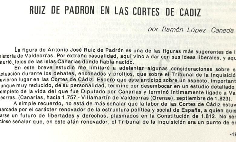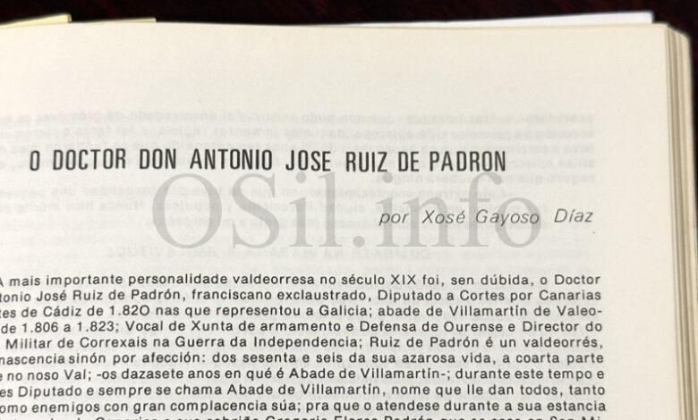 Neste mes de setembro cúmprense 200 anos do pasamento de Antonio José Ruiz de Padrón (San Sebastián de La Gomera, 1757-Vilamartín de Valdeorras, 1823), abade de Vilamartín e Deputado nas Cortes de Cádiz. Unha efeméride que se celebrará por todo o alto este venres día 8.