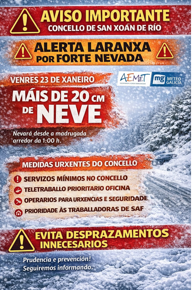 O Concello de San Xoán de Río vén de activar un dispositivo preventivo especial ante a alerta laranxa por nevadas decretada para o venres 23 de xaneiro tanto por AEMET como por MeteoGalicia, que prevén acumulacións superiores aos 20 centímetros de neve na montaña de Ourense e neste concello.