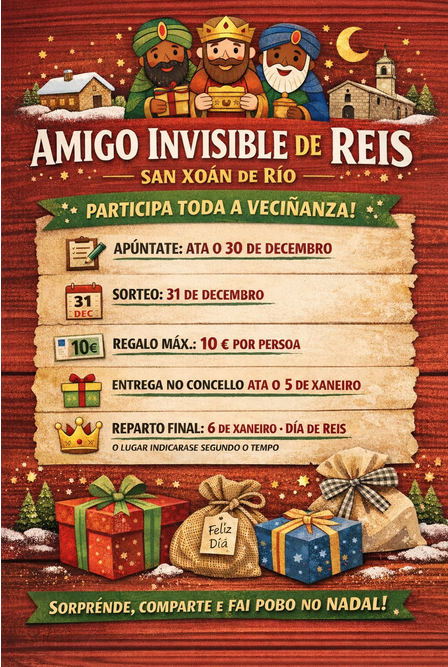 O Concello de San Xoán de Río pon en marcha este Nadal unha iniciativa participativa aberta a toda a veciñanza: o Amigo Invisible de Reis, unha proposta sinxela e accesible que busca fomentar a convivencia, a ilusión compartida e o espírito comunitario no municipio.