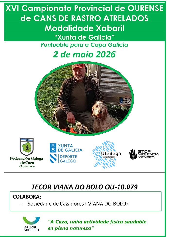Este sábado 2 de maio, celebrarase no TECOR de Viana do Bolo (OU-10.079), o XVI Campionato Provincial de Ourense de Cans de Rastro Atrelados sobre Xabarín “Xunta de Galicia”, puntuable para a Copa Galicia.